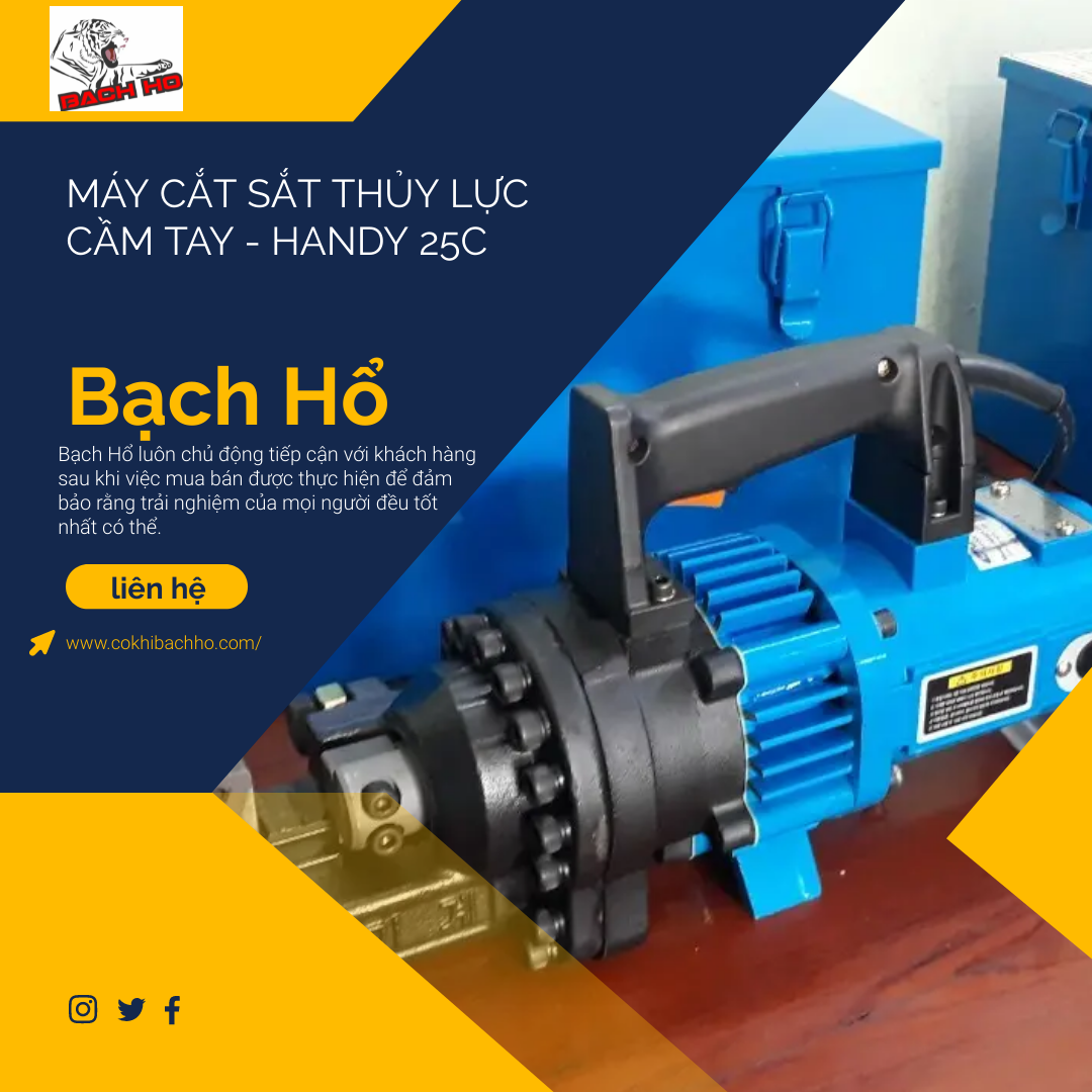 Máy cắt sắt thủy lực Handy 25C được Bạch Hổ nhập nguyên chiếc từ Hàn Quốc với chất lượng được đảm bảo, giá cạnh tranh. Kích thước (LxWxH)130 x 250 x 480 bưu kiện Hộp đựng, dầu thủy lực chuyên dụng, dụng cụ bảo dưỡng, lưỡi bổ sung máy có tốc độ cắt nhanh được trang bị moto thủy lực công suất lớn